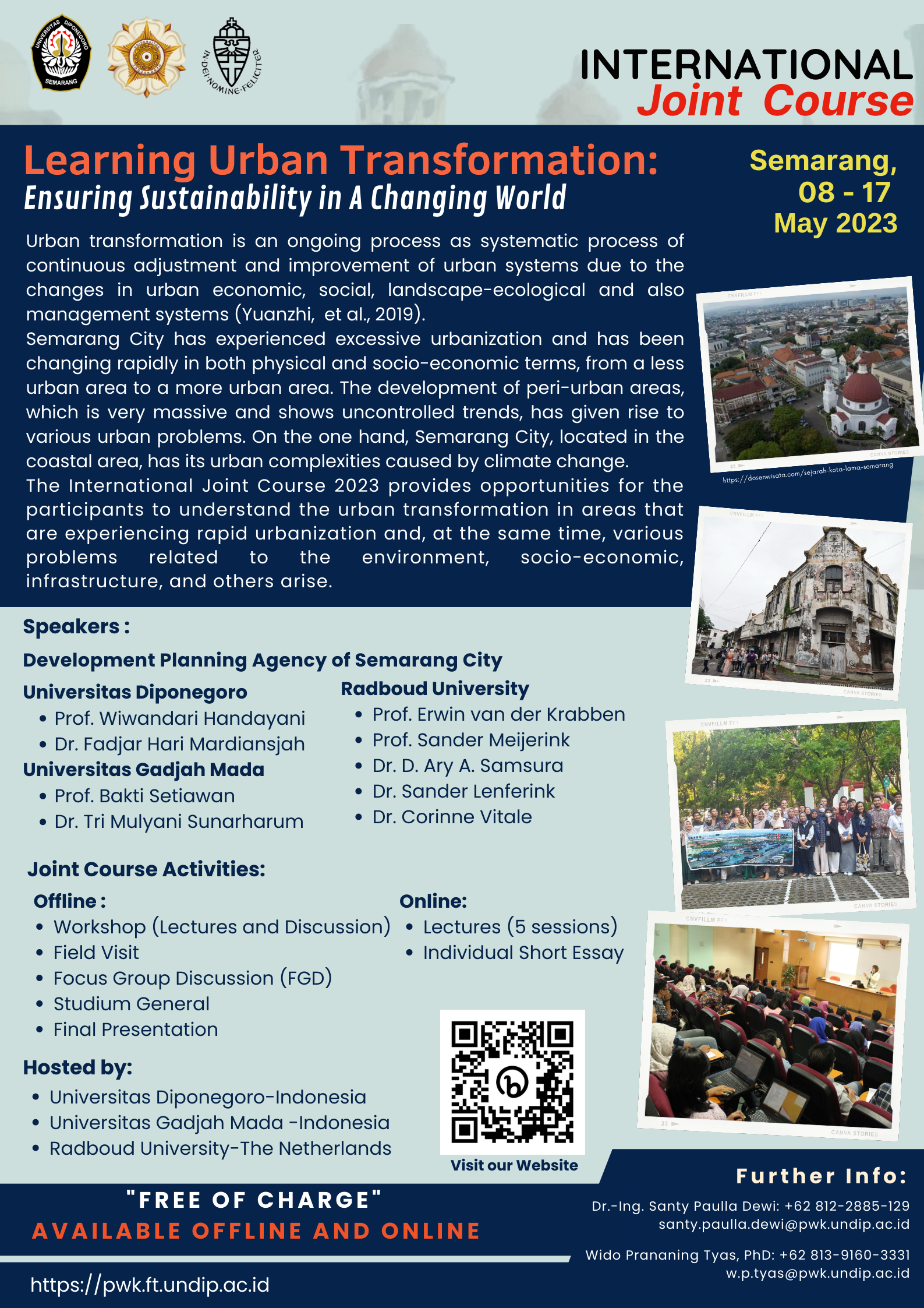 International Joint Course akan dilaksanakan pada tanggal 8 – 17 Mei 2023 kerjasama Universitas Diponegoro, Radboud University dan Universitas Gadjah Mada mengambil tema “Learning Urban Transformation: Ensuring Sustainability in A Changing World’